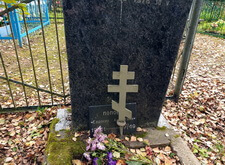 Дождавшись окончательного высыхания брусчатки вновь приезжаем на участок. Там мы восстанавливаем надписи на надгробье, размещая у его подножья восьмиконечный крестик. На этом наша работа на данном участке окончательно завершена. В результате из ничем не примечательной могилы появился презентабельный мемориальный комплекс, декорированный столиком и двумя лавочками в оградке.
